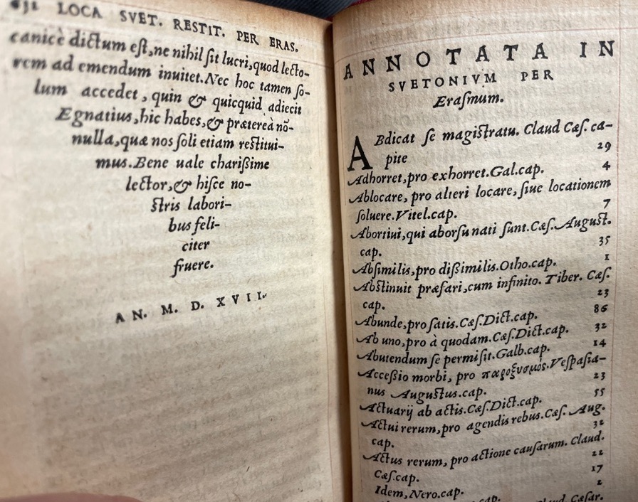 Schweiger II, 2, 975; Suetons 12 Caesarenbücher in der Edition und den Kommenateren von Erasmus in einem sehr schönen kleinen Druck mit der schönen Holzschnittdruckermarke von Gryphius auf dem Titel. „Neue Recenc. nach d. Codex Memmian. Meherere Stellen sind auch nach Conjectur gut verbessert.“ Schweiger ebd.