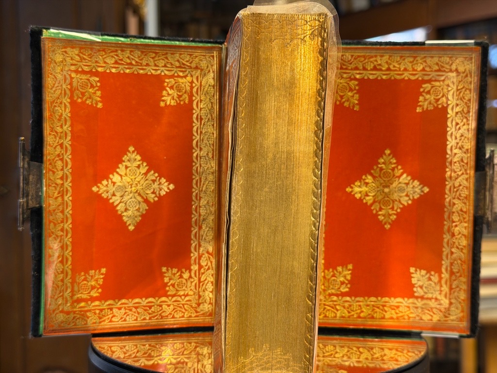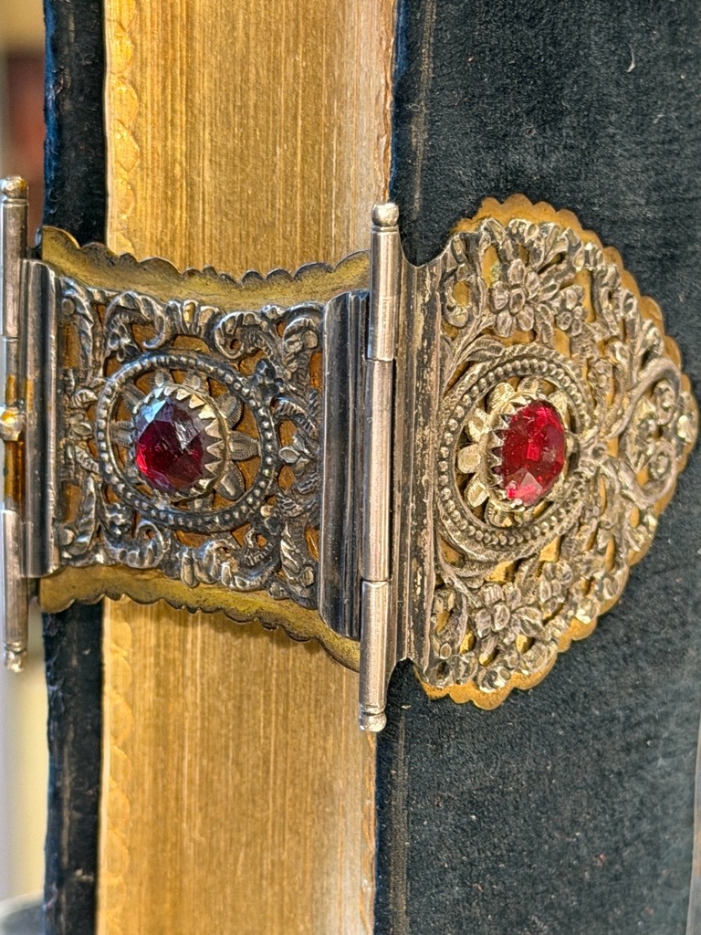 [6 nn Bll.]1008 S. [13 nn Bll. Register]; 72 S. Titelblatt mit dem Wappen von Christian dem siebten, König von Dänemark und Norwegen. Klein Oktav, nachschwarzer Samteinband (kleine Fehlstellen) Mit fein zisilierten und punzierten Silberschliessen mit dreifachem rubinfarbenem Schmucksteinbesatz, Glanzpapiervorsätzen in grün und aufwendig goldgrägtem zweiten Vorsatzapieren in Orange, der vordere mit Hochzeits-Widmungsspruch des Bräutigam an seine Gattin.