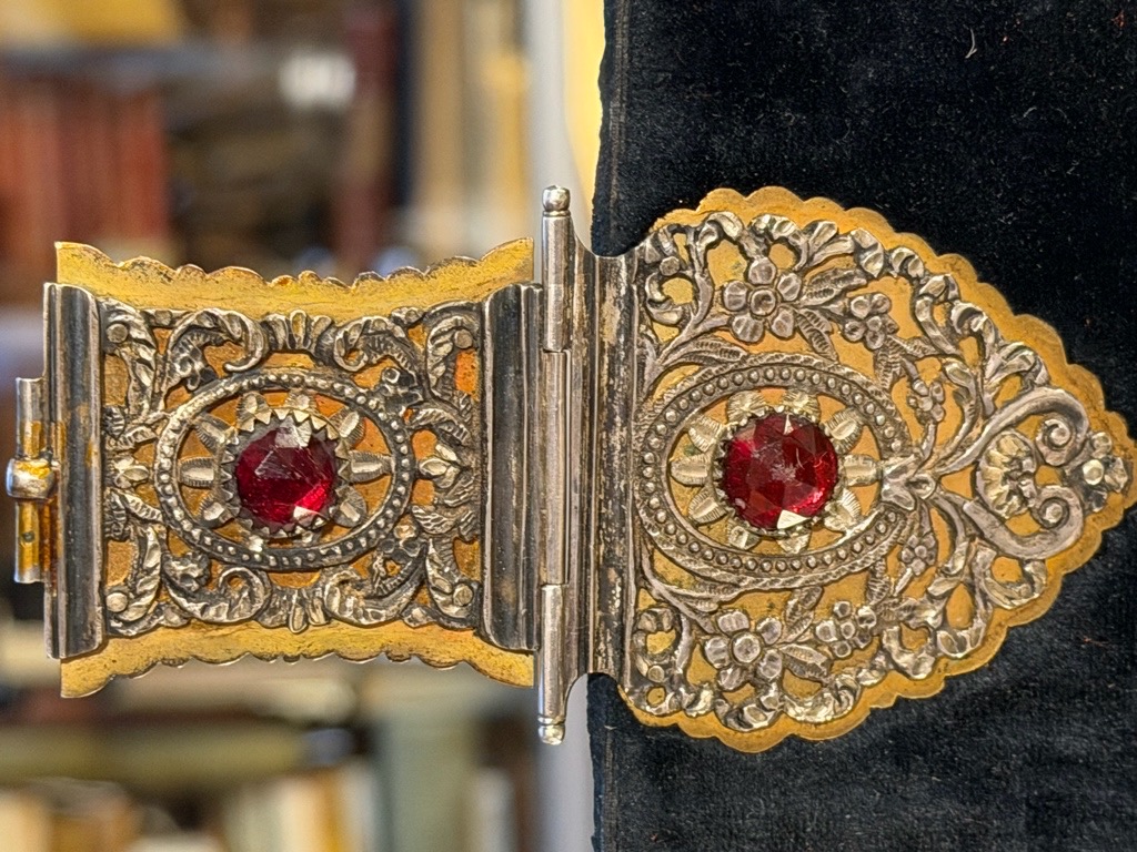 Außergewöhnlich schön gestaltetes Hochzeitsgeschenk mit dem goldgeprägter Widmung „Gott gebe uns beyde, viel Segen und Freude. Jungfer Abel Kruse aus inngster Liebe gewidmet von Claus Fülster 1832.“ Die Schliesse enthält Namen und Datum des Paares einpunziert.