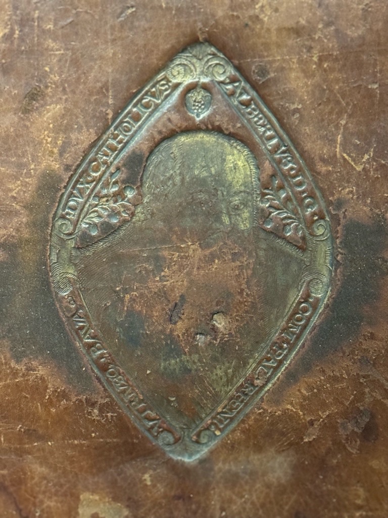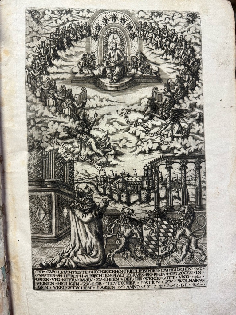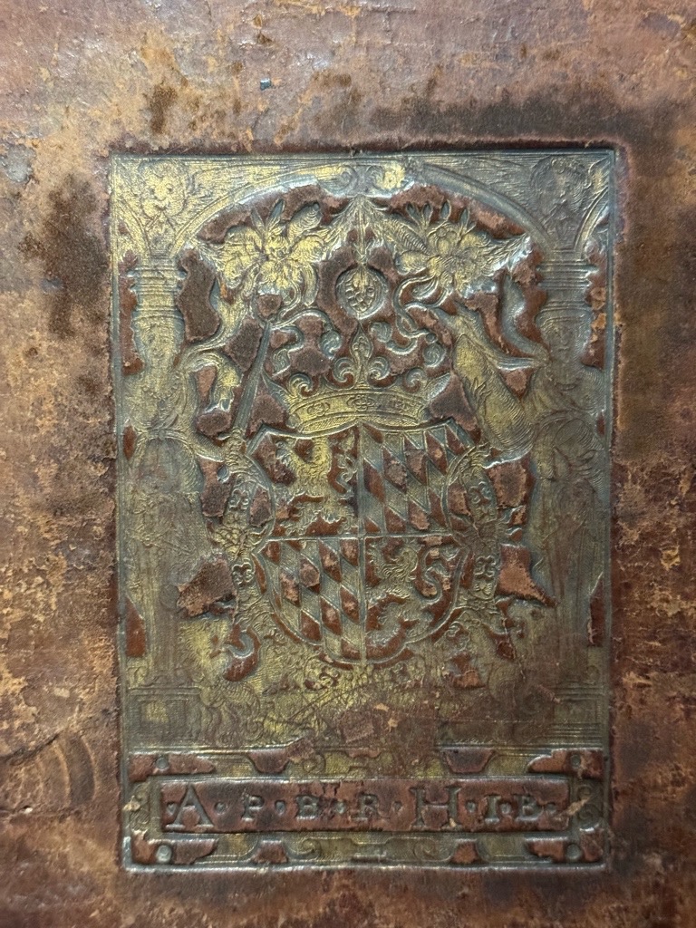 Wappeneinband Albrecht V. von Bayern und Widmung des Übersetzer Johann a Via.