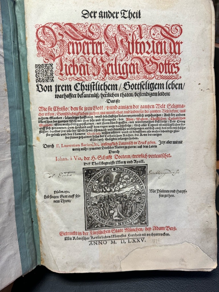 VD16, S10265 – Berühmte Sammlung von Heiligenlegenden, die ein Vorbild für spätere Sammlungen wurde. Hier die Teile 3 und 4, März und April, von insgesamt 12 Teilen. Mit handschroftlicher Widmung des Übersetzers Johann a Via auf dem vorderen Vorsatz: „Dem Hochwürdigen in Gott Vattern und Herrn, Herrn Jacobus Brobst des gefürsteten Gotzhauß Bertholsgaden etc. so Johann a Via der H. Schrifft Doctor Corherr des Stiffts Unser lieben Frauen in München und f[ürstlicher] Rath daselbs den 1. Tag Octobris A[nno] etc. [= domini] [15]75.“ Der handschriftliche Eintrag auf dem vorderen Vorsatz ist eine Widmung des Übersetzers dieses Werkes, Johann a Via, an den Fürstprobst Jakob II. ( Jakob Püterich) von Bertechsgarten ( Bertholshagen/) Johann a Via (geb. um 1520 Köln gestorben 1582 in Hildesheim) war katholischer Theologe, bayerischer Hofprediger, Pfarrer, Hofprediger, Domprediger und Übersetzer. V. wurde in Trier zum Priester geweiht, war 1554 Priester an St. Emmeran in Mainz. Im Folgejahr promovierte er zum Doktor theol. in Ingolstadt und wurde 1556 Domprediger in Worms. V. nahm am Wormser Kolloquium als Notar teil und veröffentlichte eine Antwort auf die Berichte der protestantischen Seite über das Scheitern des Gesprächs. 1561 erhielt er die Propstei im Kollegiatsstift Mosburg und wurde zugleich Stadtpfarrer an St. Martin in Landshut. Vor 1569 wurde V. Hofprediger Albrechts V. von Bayern und Kanonikus an der Münchener Liebfrauenkirche. Eine Berufung nach Wien durch Kaiser Maximilian II. scheiterte 1569 an dem Einspruch des päpstlichen Nuntius. 1581 wurde er als Dechant und Offizial an das Stift St. Moritz in Hildesheim berufen, wo er bald darauf starb. A Via veröffentlichte zahlreiche Schriften, darunter Konfessionspolemiken gegen Jakob Andreae und andere, und wurde selber zur Zielscheibe zum Teil beißenden Spottes. (zitiert nach GND: 11739680X) Von Albrecht dem V. von Bayern zur Übertragung der vorliegenden Heiligen Legenden von Laurentius Sirius aus dem Lateinischen ins Deutsche beauftrag (siehe Titel). Eintrag Titelblatt vgl. Exemplar der BSB L-192 vermutlich Augustiner Chorherrenstift Berchtesgaden. . Porträt- und Wappensupralibros Vorderdeckel (stärker berieben): Werkzeug p002568 ID: 130771m Erfassungsstatus: Veröffentlicht Erfassungsinformation: Erfasst: 19.08.2008 14:07:36 / Zuletzt bearbeitet: 01.06.2023 19:57:05 Dublette zu: 128494b Typ: Platte Zitiernummer: p002568 Haeblernummer: II 64, II Größe: 125 x 82 Umrissform: Spitzoval Motiv: Albrecht von Bayern, Herzog | Halbfigur | nach rechts Motivdetails: Zusätze: ALBERTVS D G / COM PAL RHENI / VTRIVSQ BAVA / DVX CATHOLICVS (Rand Spitzoval) Werkstätten: w003893 / Kaspar Ritter, München (Kaspar Ritter) w003885 / Leonard Ostertag, München (Leonard Ostertag) Freitext: Negativ gestochene Platte. Diese Platte ist identisch mit der Platte Zitiernr.: EBDB p002091. Literaturverweise: Bucheinbände aus elf Jahrhunderten. Ausgewählt und beschrieben von Ferdinand Geldner, München 1958, S. 32 u. Taf. LXIV, Abb. 84. — Geldner, Ferdinand: Die Porträt- und Wappensupralibros Herzog Albrechts V. von Bayern. In: GJ 1958, S. 298-314, S. 307, Abb. 10. — Außen-Ansichten. Bucheinbände aus 1000 Jahren aus den Beständen der Bayerischen Staatsbibliothek München. Herausgegeben von Bettina Wagner. Wiesbaden 2006, Kat.-Nr. 51 Hinterdeckel (leicht berieben): Werkzeug p002569 ID: 130772m Erfassungsstatus: Veröffentlicht Erfassungsinformation: Erfasst: 19.08.2008 14:29:10 / Zuletzt bearbeitet: 01.06.2023 19:57:06 Dublette zu: 128495b Typ: Platte Zitiernummer: p002569 Größe: 125 x 87 Motiv: Wappen Bayern | Territorium | Albrecht von Bayern, Herzog Motivdetails: Keine Angaben Motiv: Justitia Motivdetails: Keine Angaben Motiv: Temperantia Motivdetails: Keine Angaben Beschriftung: A P B R H I B Werkstätten: w003893 / Kaspar Ritter, München (Kaspar Ritter) Freitext: Wappensupralibros Herzog Albrechts V. von Bayern. A P B R H I B (= Albrecht Pfalzgraf bei Rhein Herzog in Bayern) Literaturverweise: Geldner, Ferdinand: Die Porträt- und Wappensupralibros Herzog Albrechts V. von Bayern. In: GJ 1958, S. 298-314; S. 308, Abb. 11