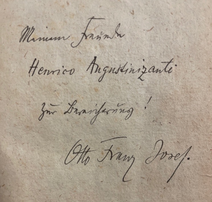 Hübsche deutsche Ausgabe der Augustinus-Bekenntnisse, sehr wohlerhalten. Mit handschriftlicher Widmung von Erzherzog Otto Franz Josef Carl Ludwig Maria von Österreich, der schöne Erzherzog (* 21. April 1865 in Graz; † 1. November 1906 in Wien), er entstammte dem Geschlecht der Habsburger. Er war der nächstälteste Bruder des Erzherzog-Thronfolgers Franz Ferdinand und der Vater des letzten Kaisers Karl von Österreich.