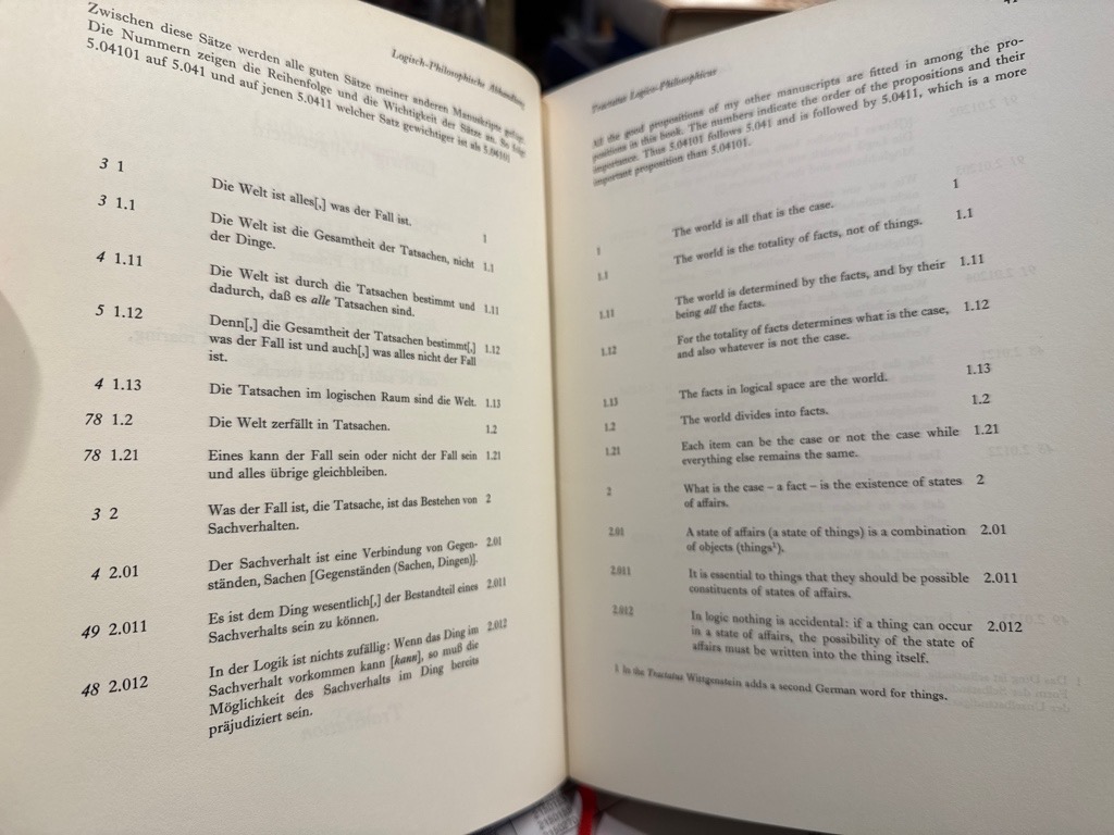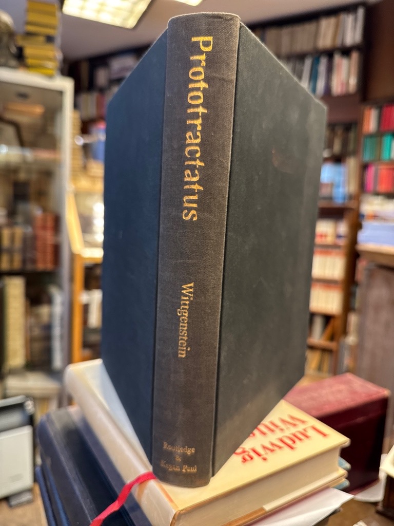 Erste Ausgabe des sensationellen Fundes der Frühfassung von Wittgensteins Tractatus. Das Prototractatus-Manuskript wurde 1965 in Wien von G. H. von Wright, Wittgensteins Nachfolger als Professor für Philosophie in Cambridge, entdeckt. Das Manuskript enthält 30 Bemerkungen und sechs nicht nummerierte Absätze, die im veröffentlichten Tractatus nicht zu finden sind. Diese Ausgabe enthält ein fotografisches Faksimile des Manuskripts und eine Transkription des deutschen Originals mit gegenüberliegender englischer Übersetzung. Gutes nur minimal lichtrandiges Exemplar.