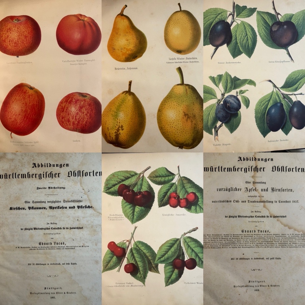 Abbildungen württembergischer Obstsorten. Eine Sammlung vorzüglicher Apfel- und Birnsorten ausgewählt bei der vaterländischen Obst- und Traubenausstellung in Cannstatt 1857. Mit 50 Abb. in Farbendruck auf 12 Tafeln. Dazu: Ders.: Zweite Abtheilung. Eine Sammlung vorzüglicher Steinobstfrüchte: Kirschen, Pflaumen, Aprikosen und Pfirsiche. Mit 6 Farbtafeln.